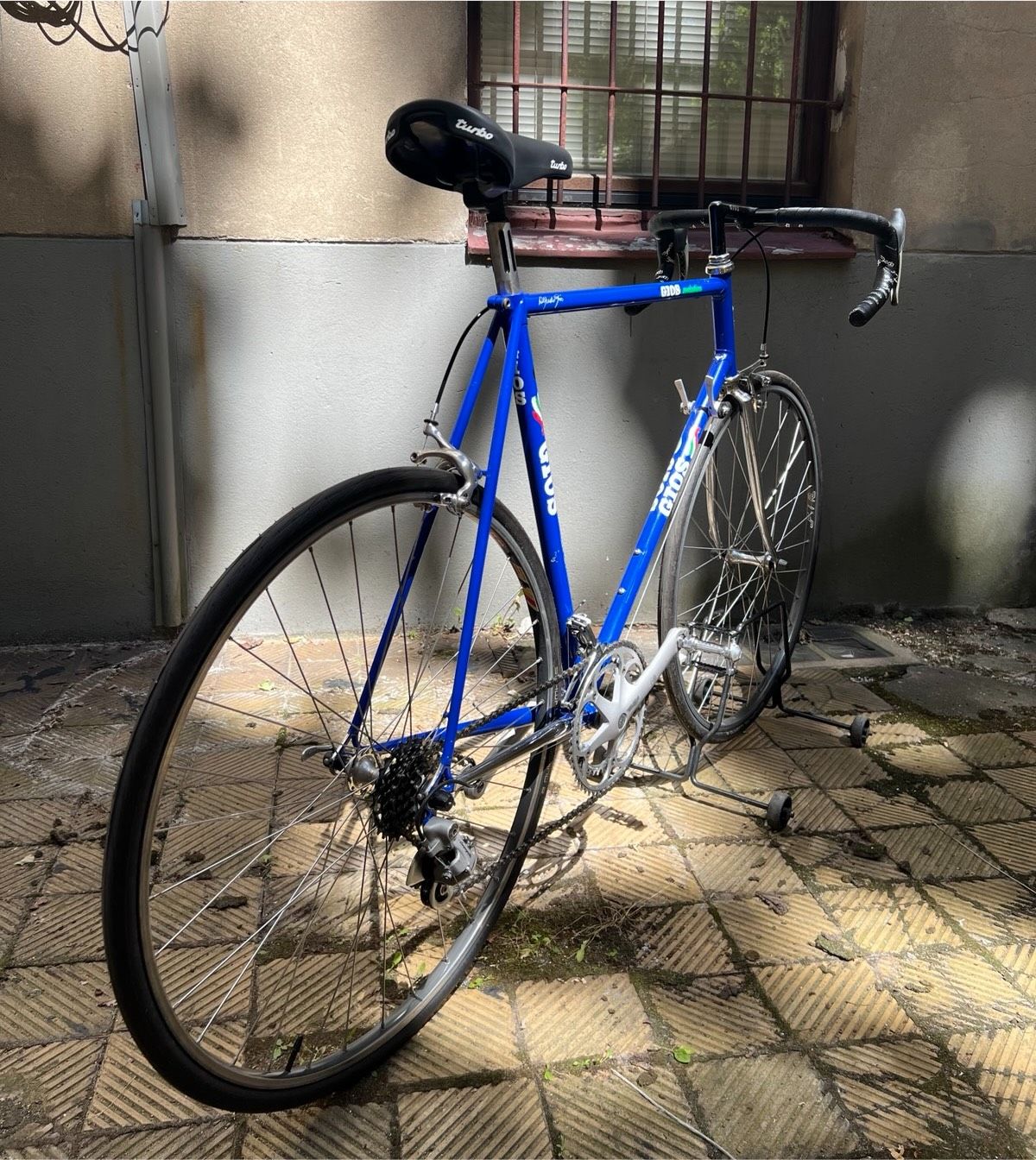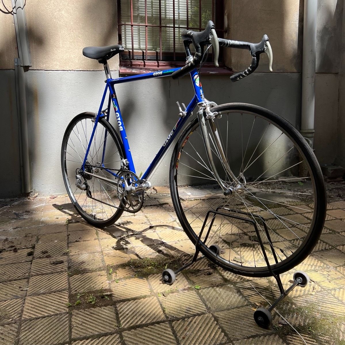 Gios Evolution im typischen Gios-Blau. Handgefertigter Stahlrahmen, XL/XXL. Sehr guter Originalzustand mit pantographiertem Vorbau. Komplett überholt.